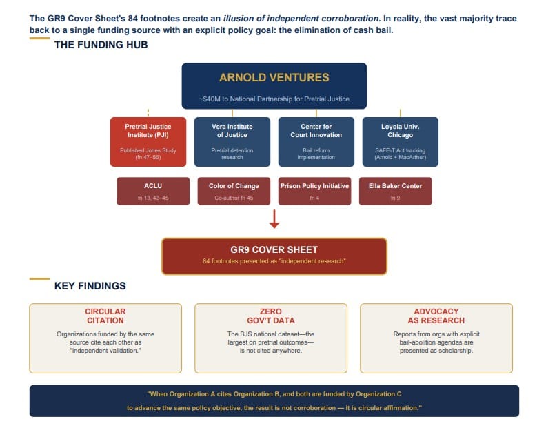 The vast majority of the studies, reports, and policy papers cited in the proposal do not come from independent research institutions or government agencies. They come from a tight network of advocacy organizations that share the same funding source, cite each other's work, and have publicly stated goals of eliminating cash bail.